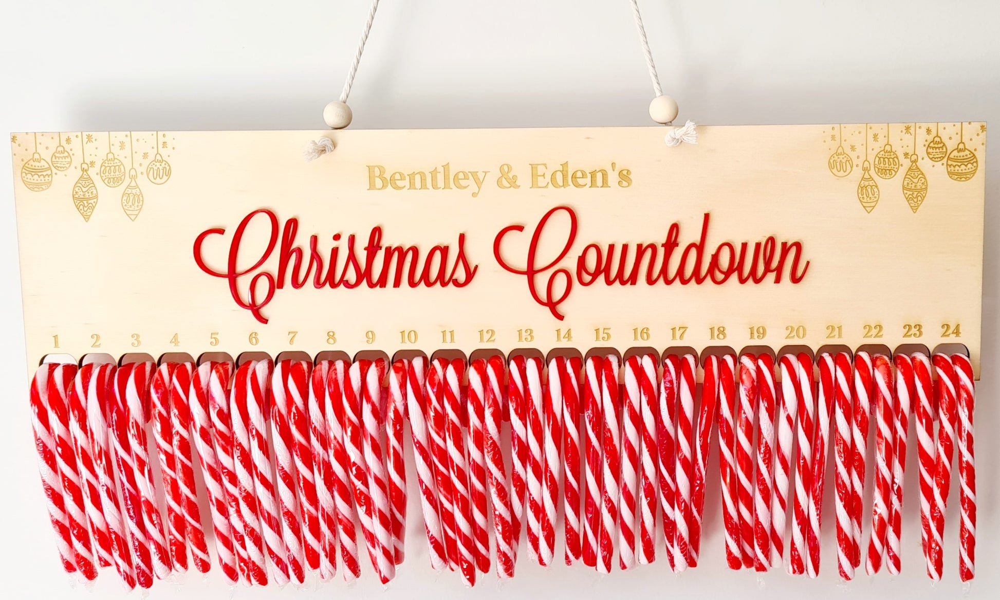 This countdown is made for 2 sets of candy canes and personalised with 2 names.
